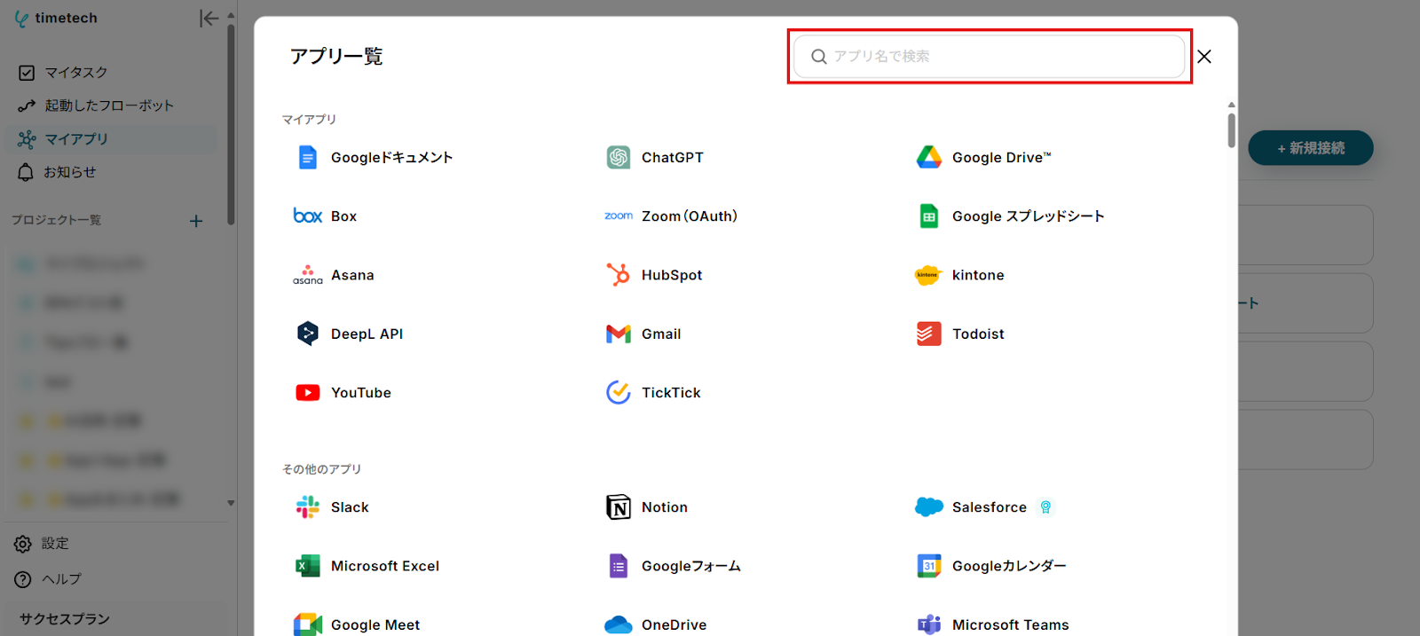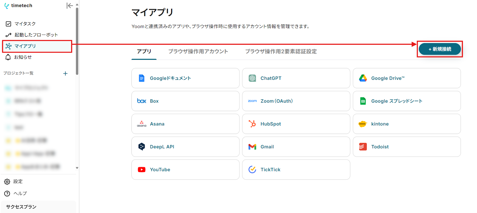 - マイアプリ画面の右側にある「+新規接続」をクリック。