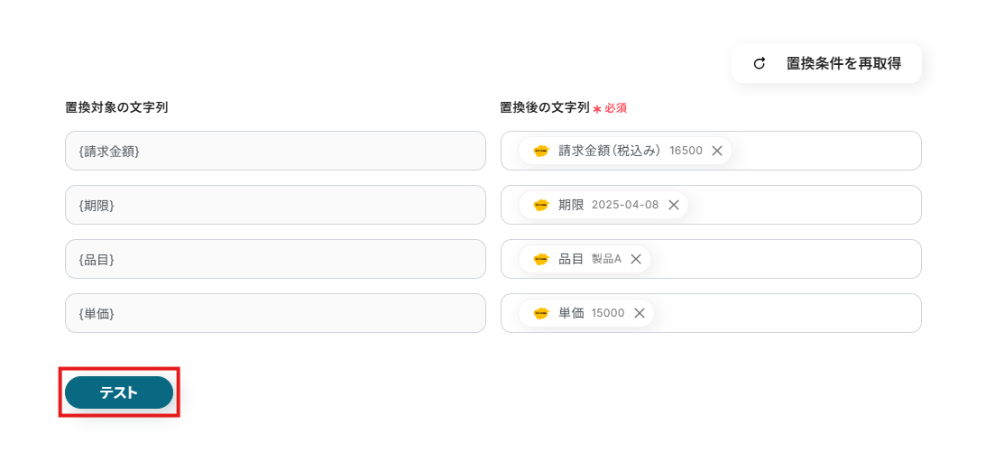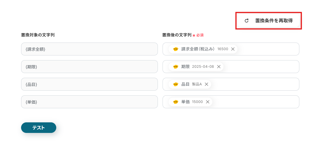 置換対象の文字列を指定した雛形ドキュメントに合わせる場合は、「置換条件を再取得」をクリックしてください。