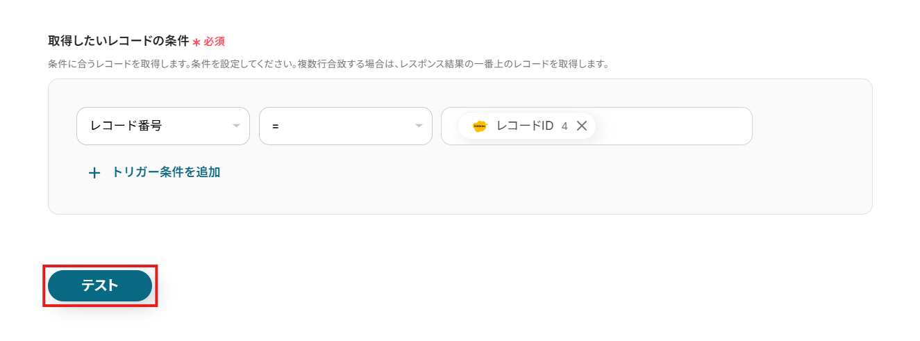 - 取得したいレコードの条件として「レコード番号」「=」「{{レコードID}}」を設定。