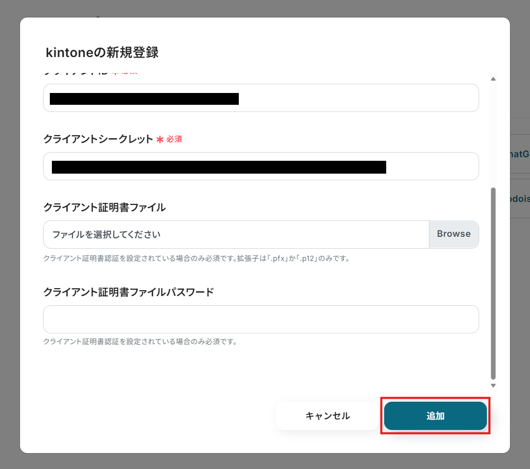 - 「サブドメイン」「クライアントID」「クライアントシークレット」をそれぞれ入力。
