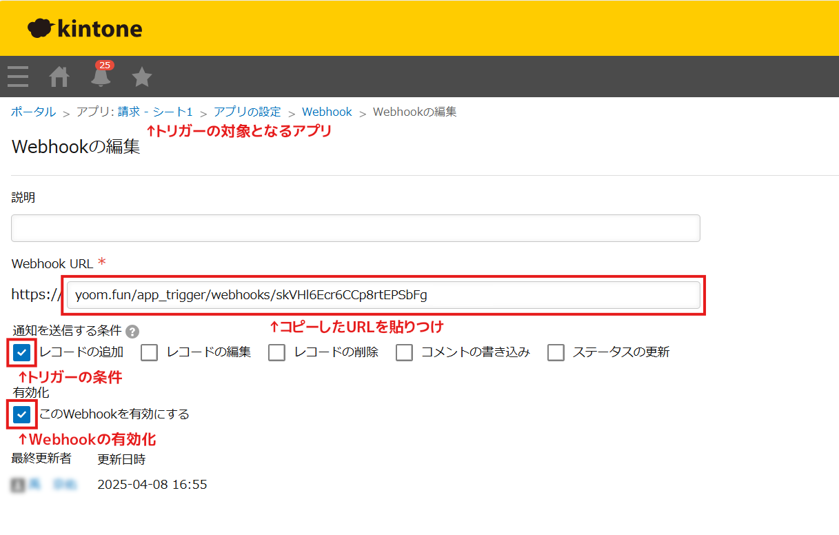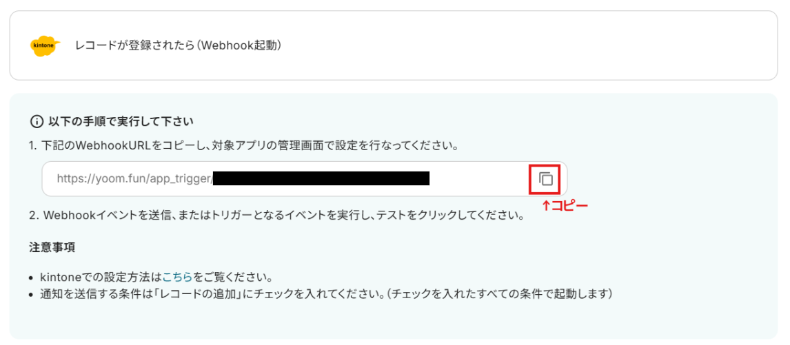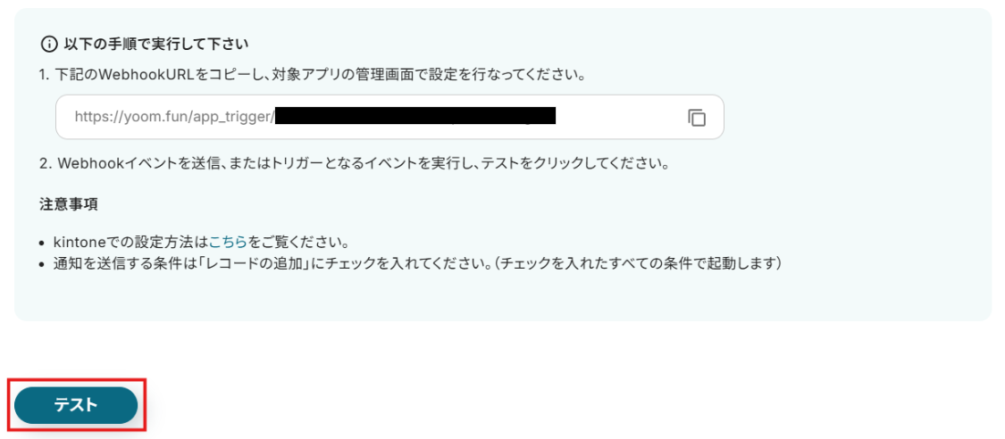 - 対象となるkintoneアプリの管理画面でWehbookを設定。