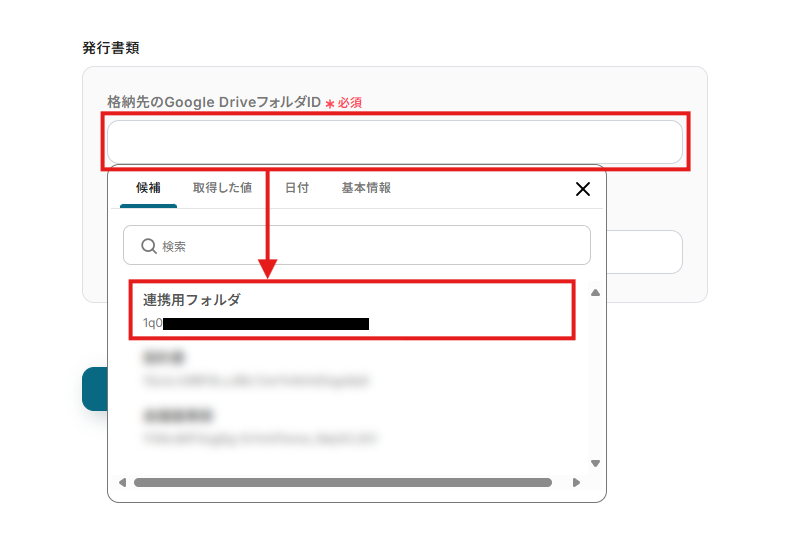 同じく入力欄をクリックすると、連携しているGoogleアカウントから候補が表示されるので、対象となるフォルダを選択します。