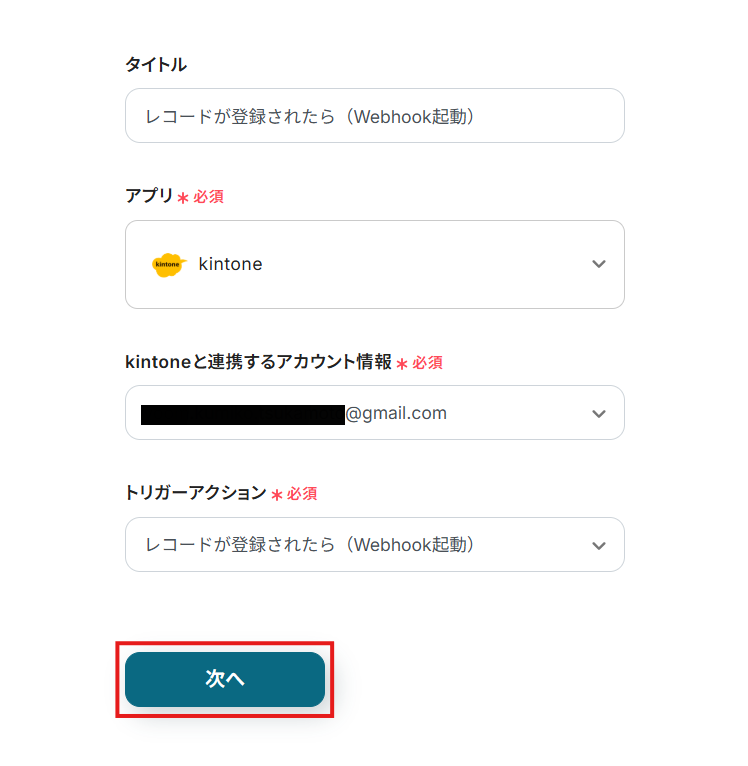 - kintoneの「レコードが登録されたら(Webhook起動)」をクリック。