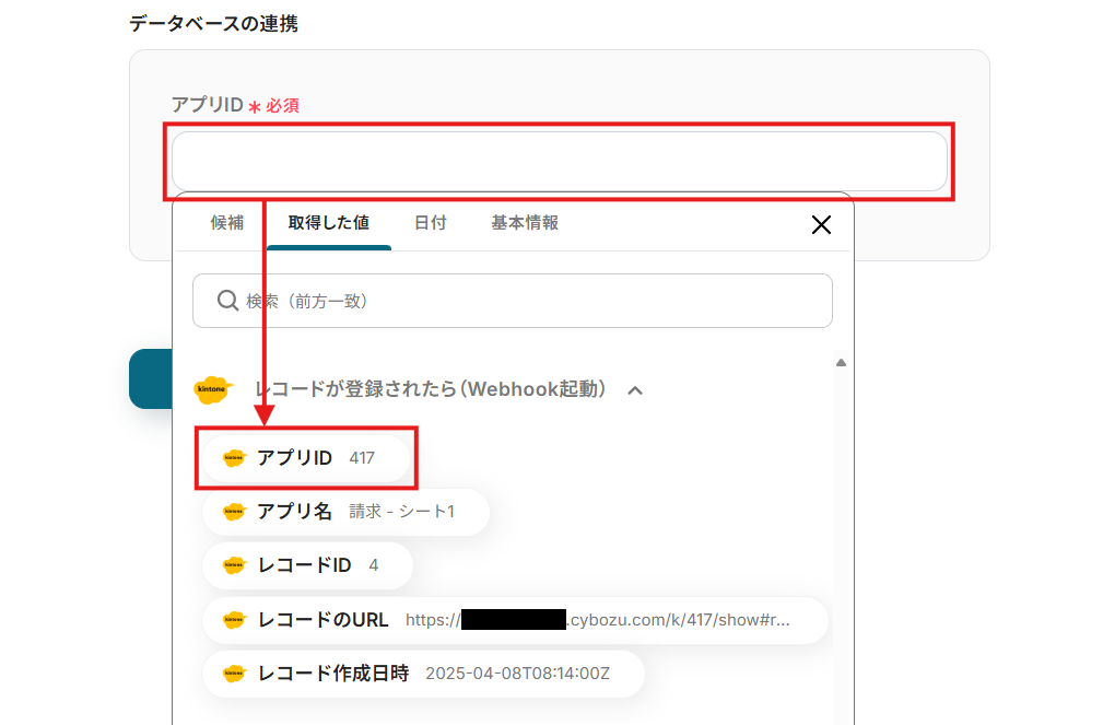 入力欄クリック後、「取得した値」タブの「レコードが登録されたら(Webhook起動)」のメニューから、ステップ3で取得した値を選択できます。