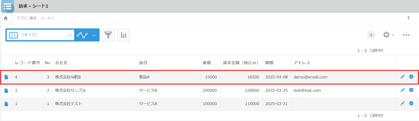 - テスト用に対象アプリでレコードを登録後、「テスト」をクリック。