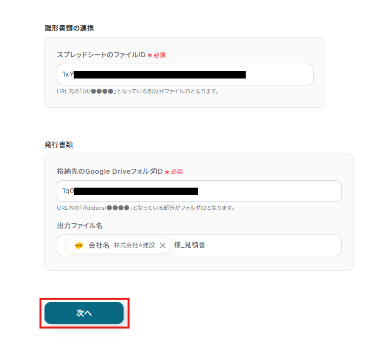 - 「スプレッドシートのファイルID」に雛形となるスプレッドシートのIDを設定。