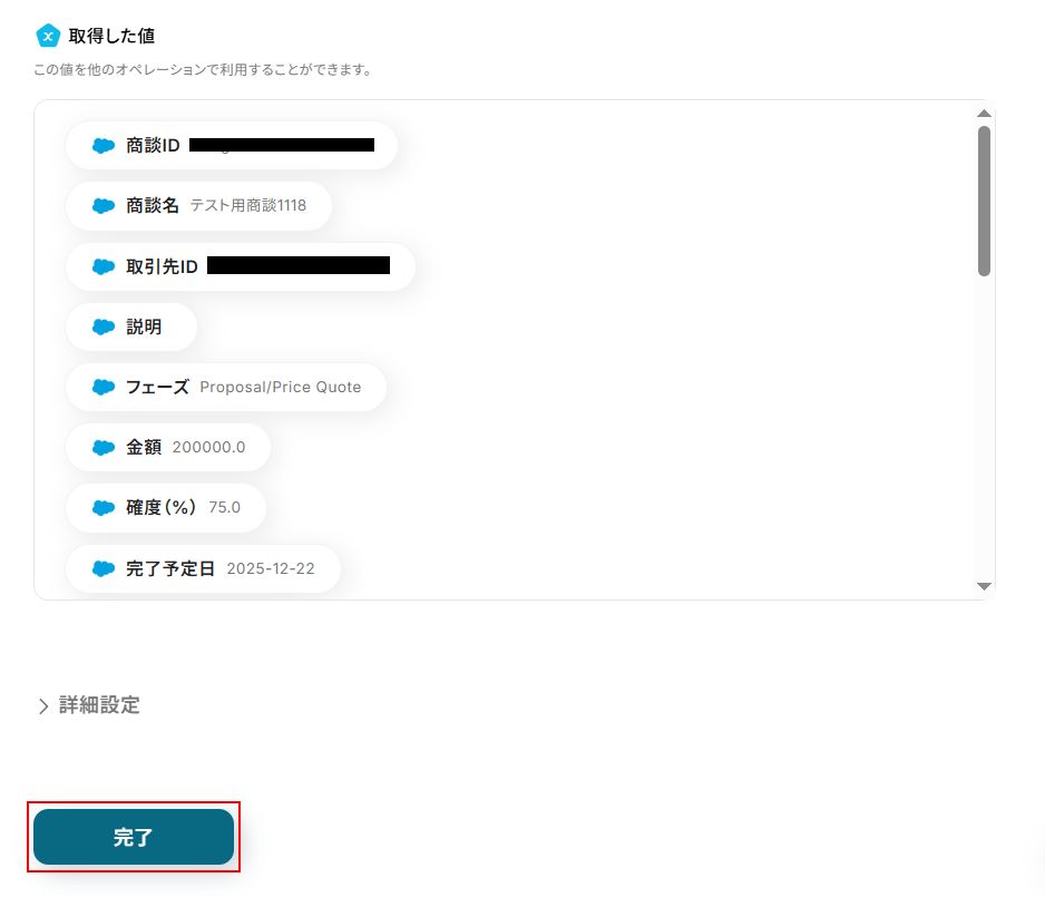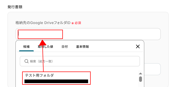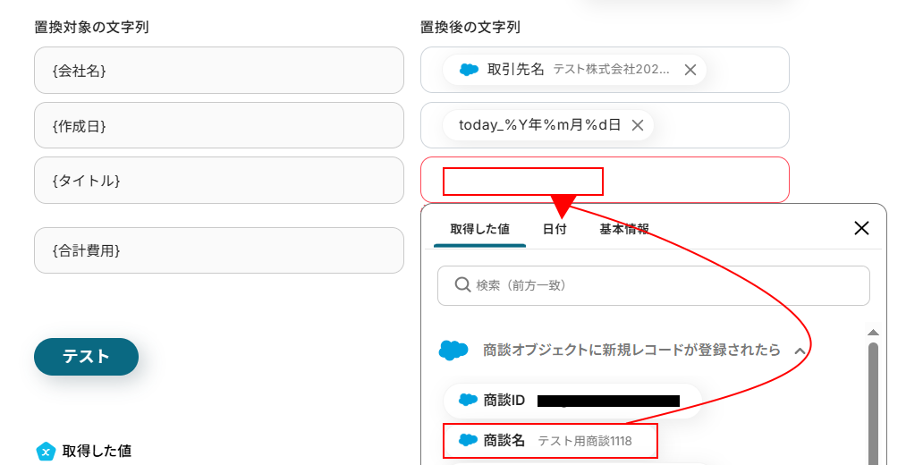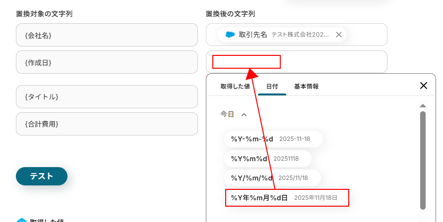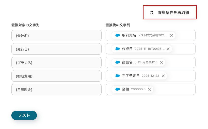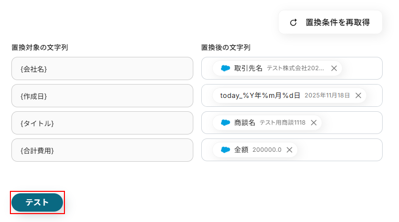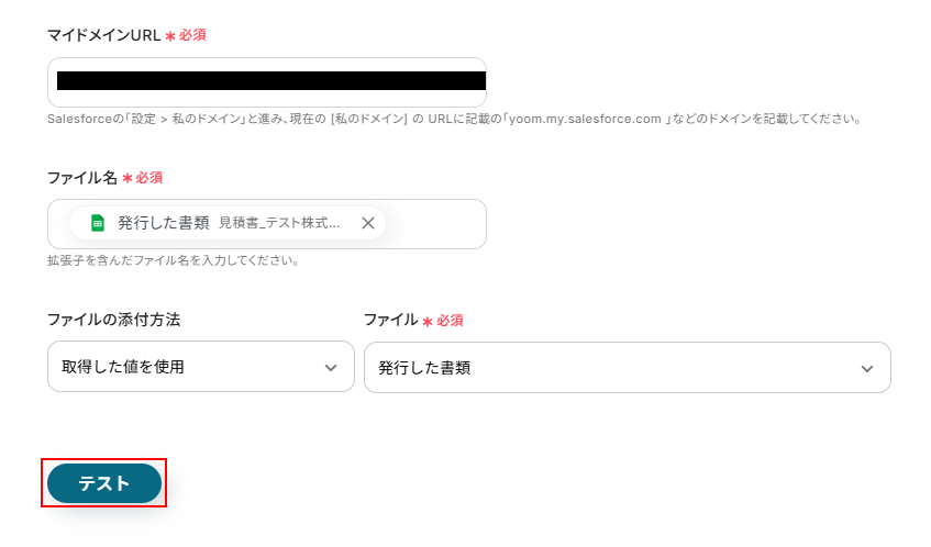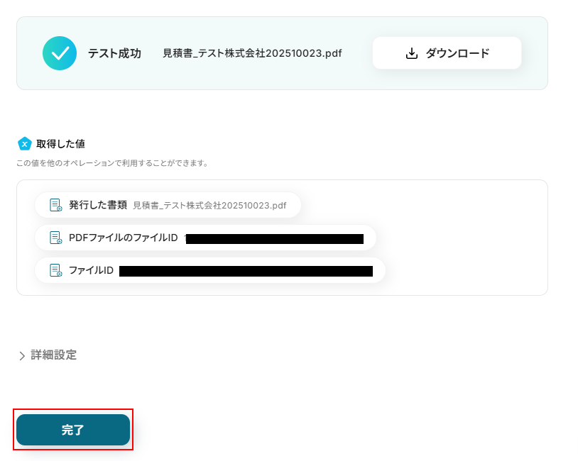 取得した値を使用、発行した書類となっていることを確認したらテストをクリックしましょう。
