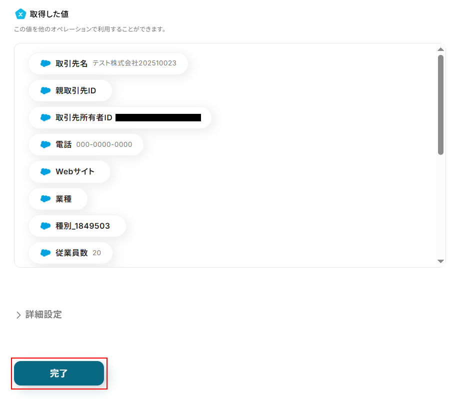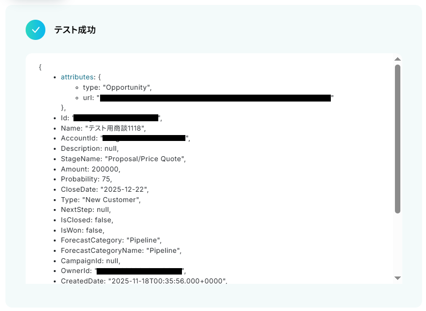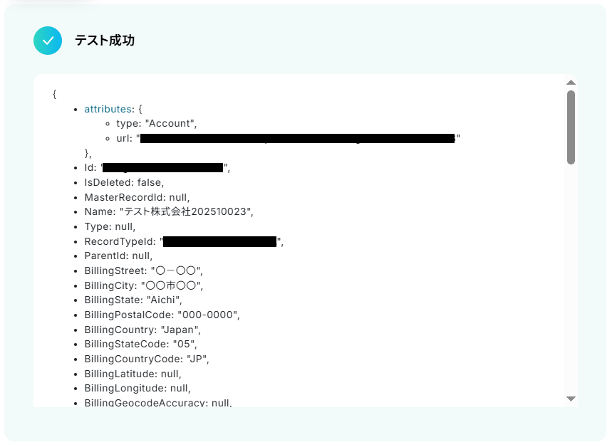 テストに成功するとテスト成功画面と取得した値が表示されますのでご確認ください。