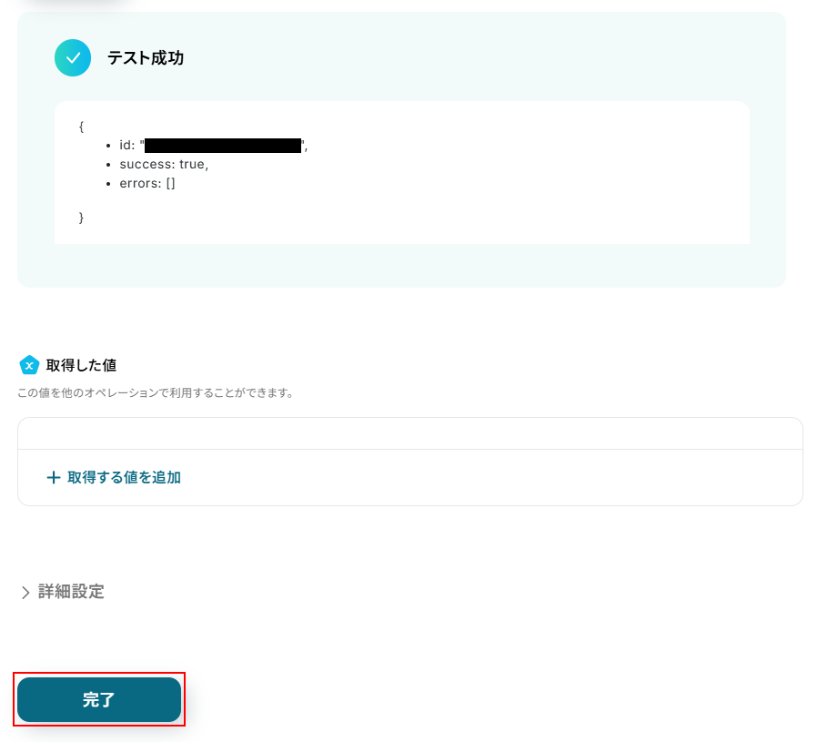 取得した値は実行した結果が設定される動的な値として利用できるため、このあとの設定でも使用します。