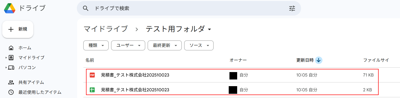 また、実際に指定したGoogle Drive内にファイルが保存されていますので確認してください。