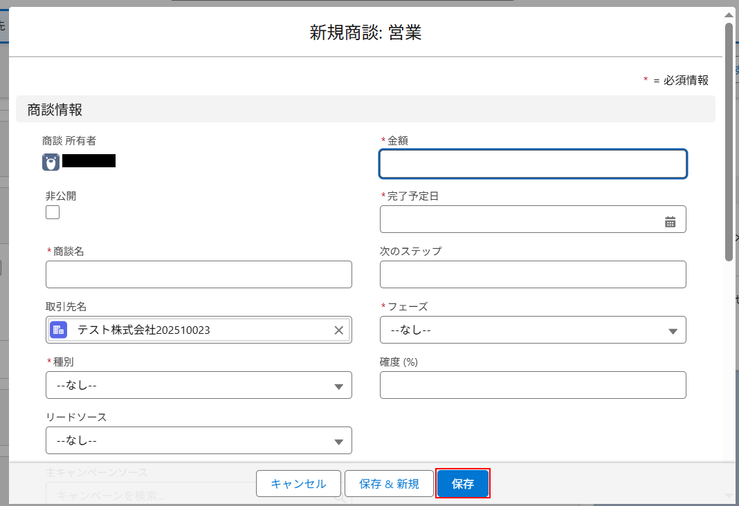 Salesforceの画面に移動し、商談オブジェクトに新規レコードを登録します。