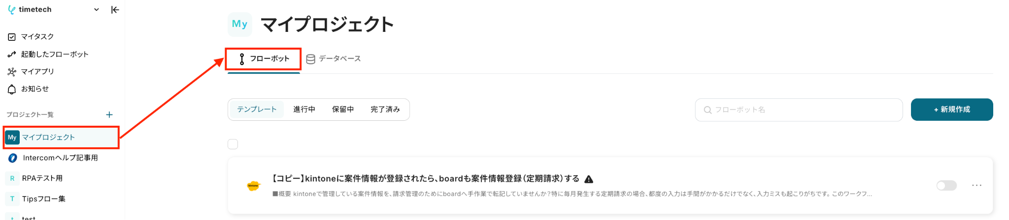 Yoomの画面左側にあるメニュー欄から「マイプロジェクト」にアクセスし、「フローボット」を選択すると、「【コピー】kintoneに案件情報が登録されたら、boardも案件情報登録(定期請求)する」という名前で格納されているはずです。