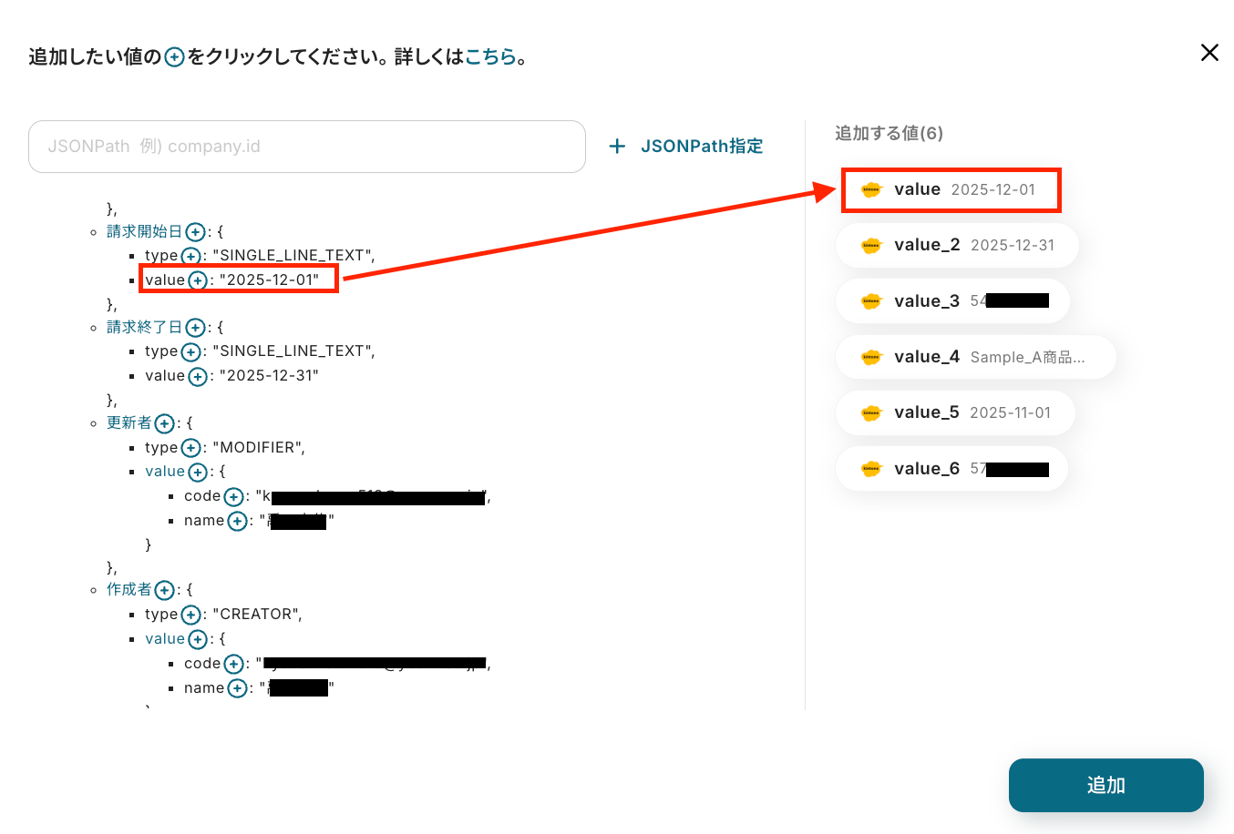 各項目をそれぞれ以下のように入力し、「追加」を押したらYoomとの連携は完了です!