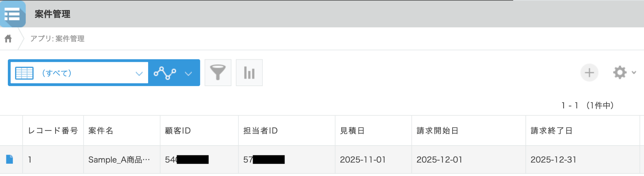 設定が完了したら動作確認のためにテストを行いますので、kintoneのアプリ内にレコードを追加してください。