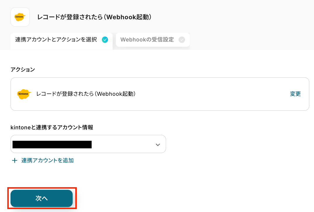 アクションは「レコードが登録されたら(Webhook起動)」であることを確認してくださいね!