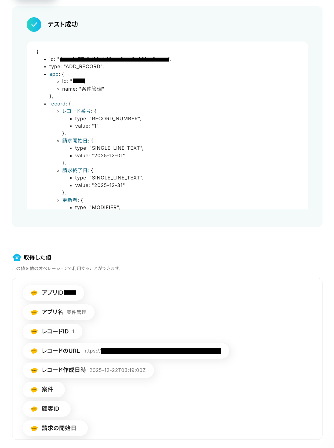 - kintoneのトリガーのアウトプットはJSONPathから取得可能です。取得方法は「『取得する値』を追加する方法」をご参照ください。