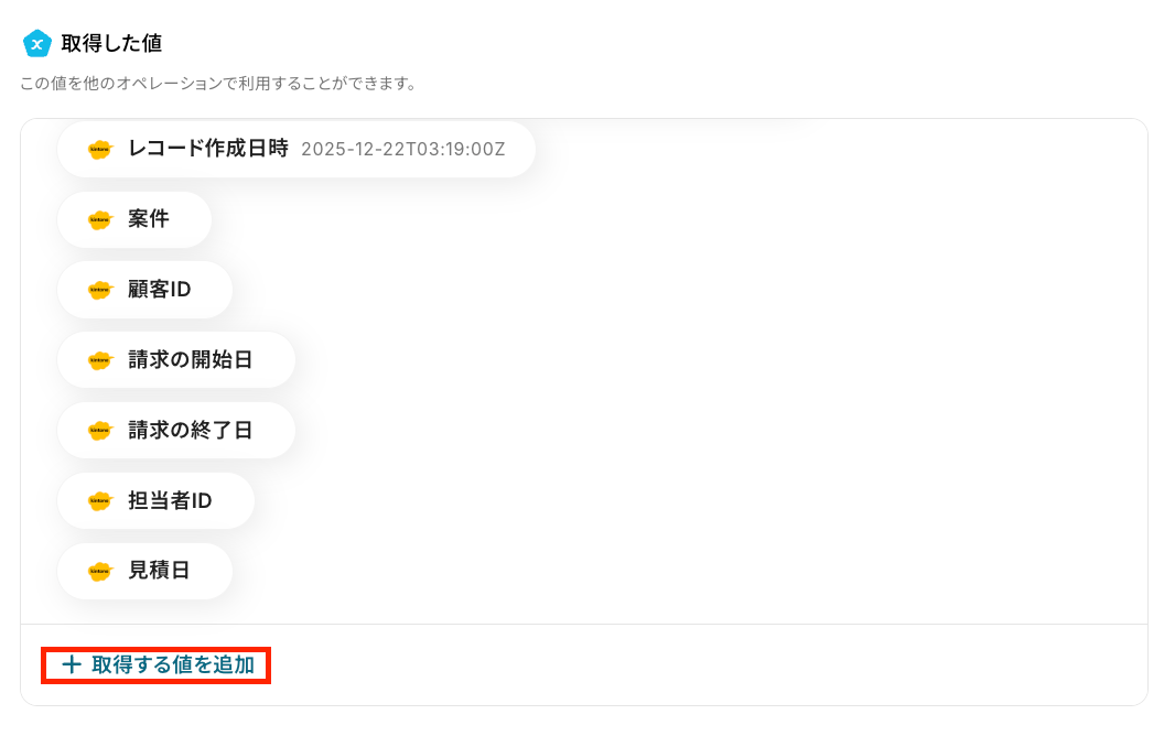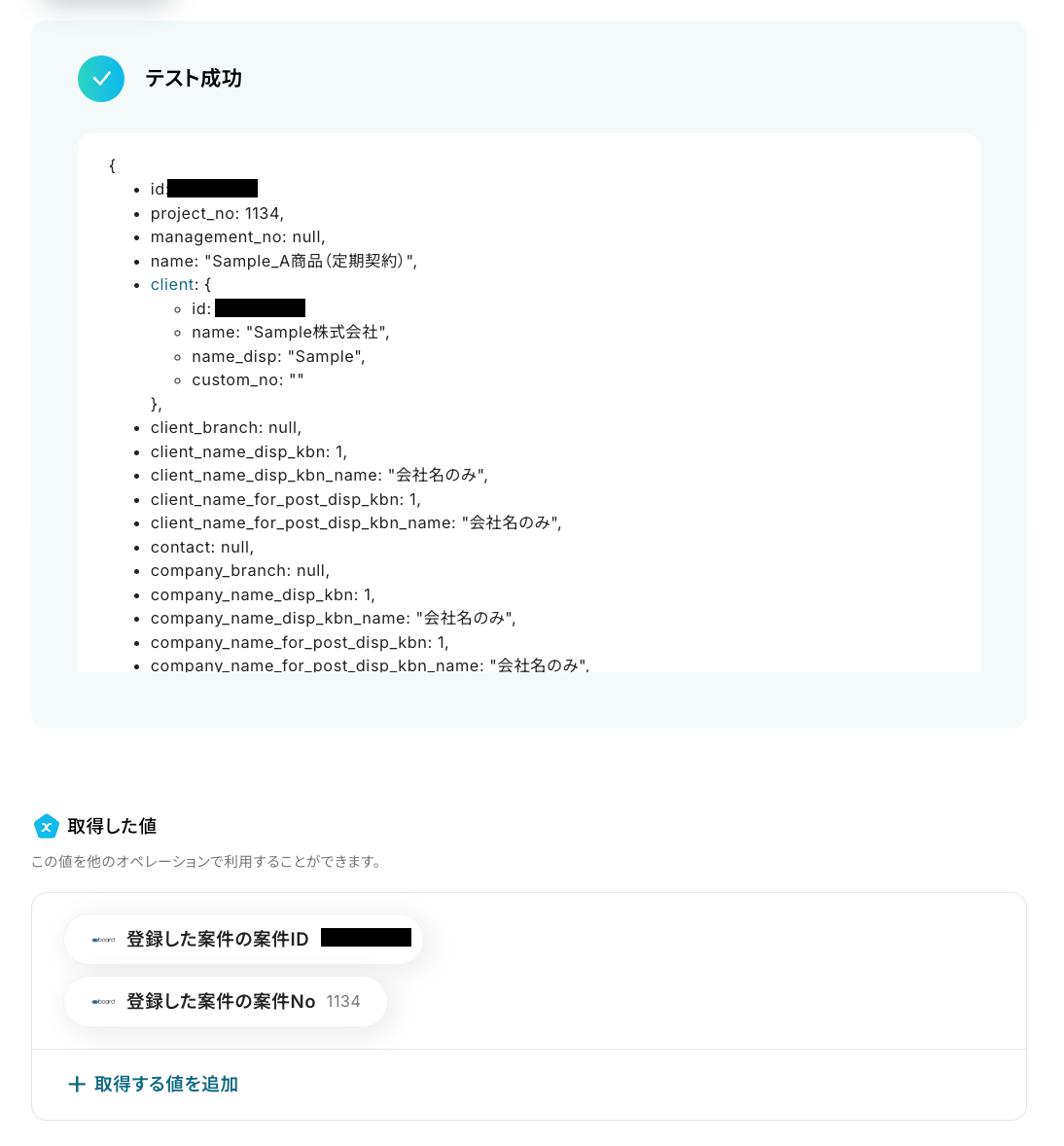 - boardに顧客を登録するアクションでは、顧客名や住所、備考欄など、登録したい各項目に、固定値や前段のオペレーションで取得・生成した情報を変数として設定してください。