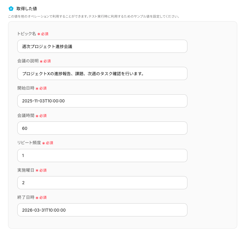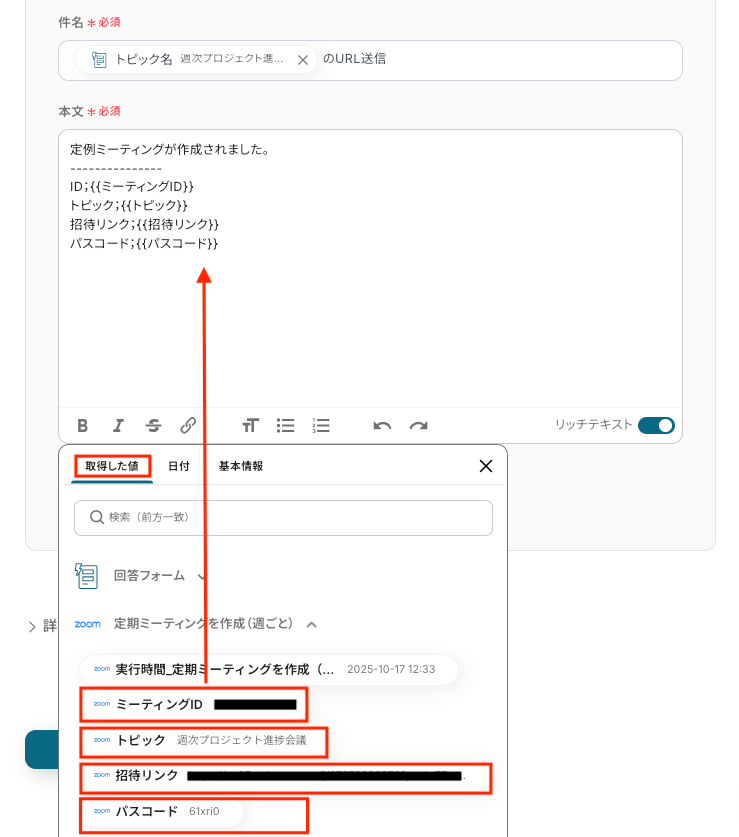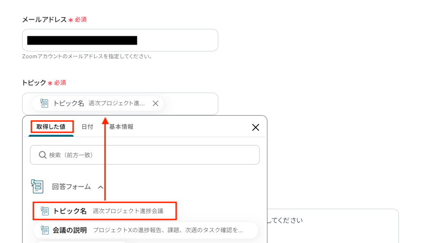 「メールアドレス」を手動で入力し、「トピック(ミーティング名)」は取得した値から選択します。