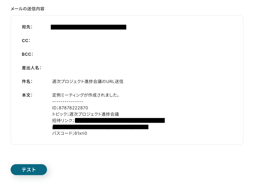「メールの送信内容」を確認し、「テスト」をクリックしてください。