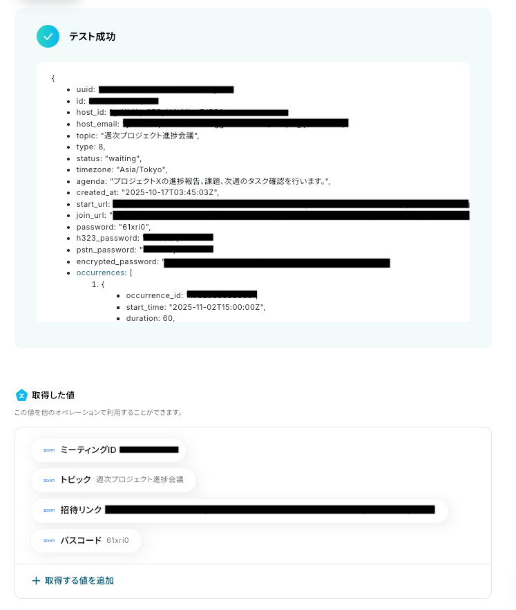 テストを実行し、Zoomにミーティングが作成されていれば、設定完了です。