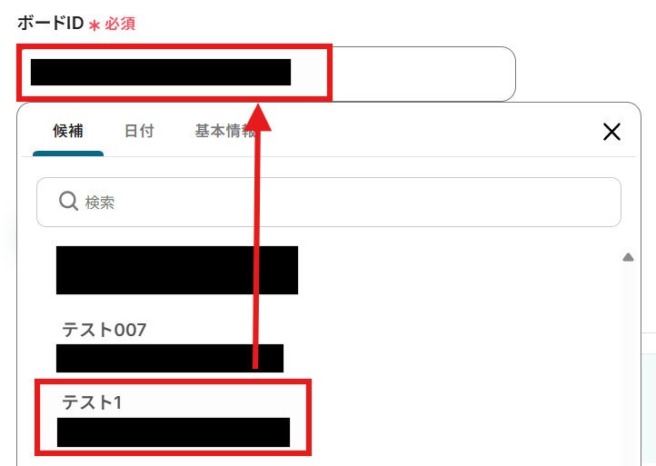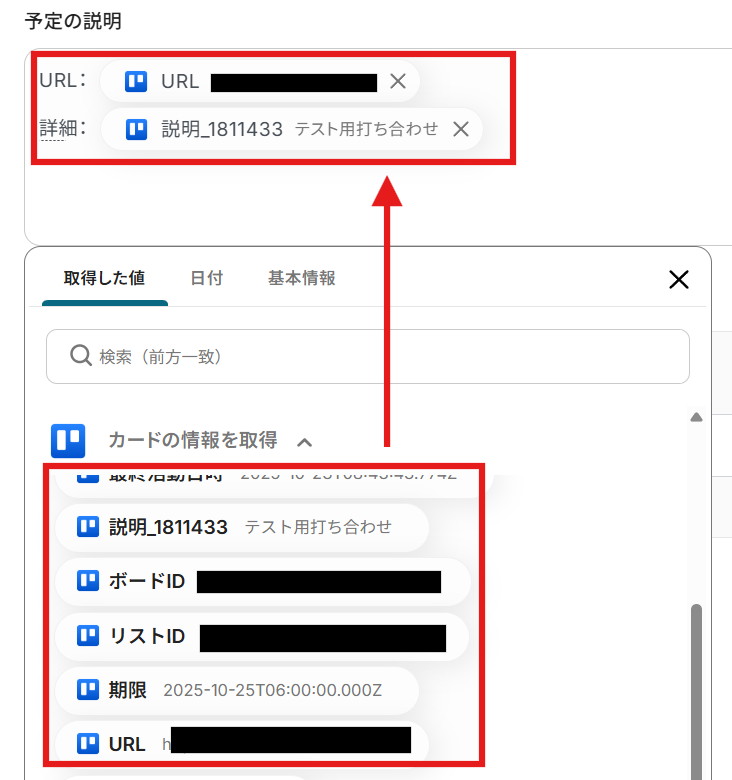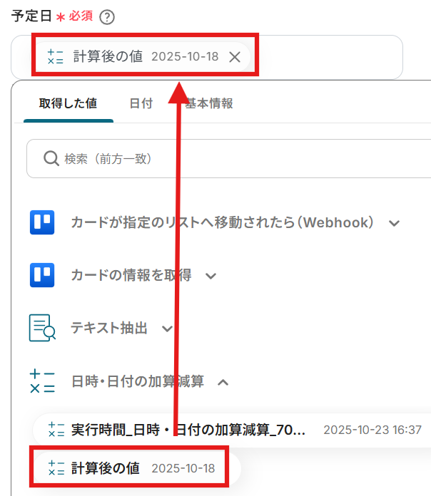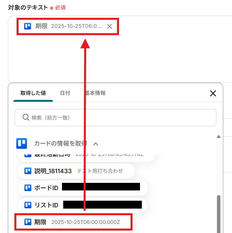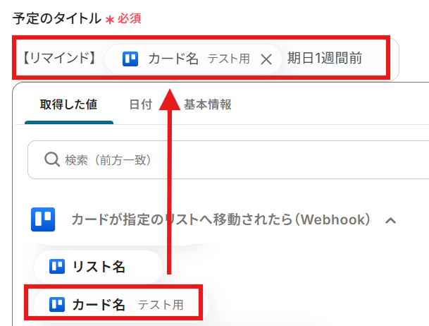 入力欄をクリックすると選択肢が表示されますので、カードの情報を取得した際の「取得した値」の中から選びましょう。