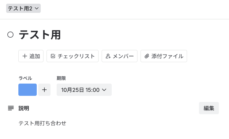 今回は以下のカードを作成し「テスト用2」のリストに移動させてみました。