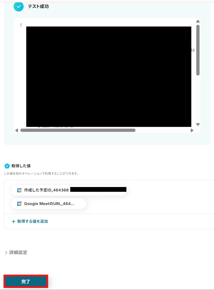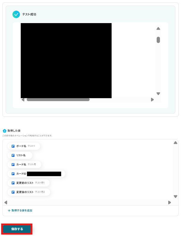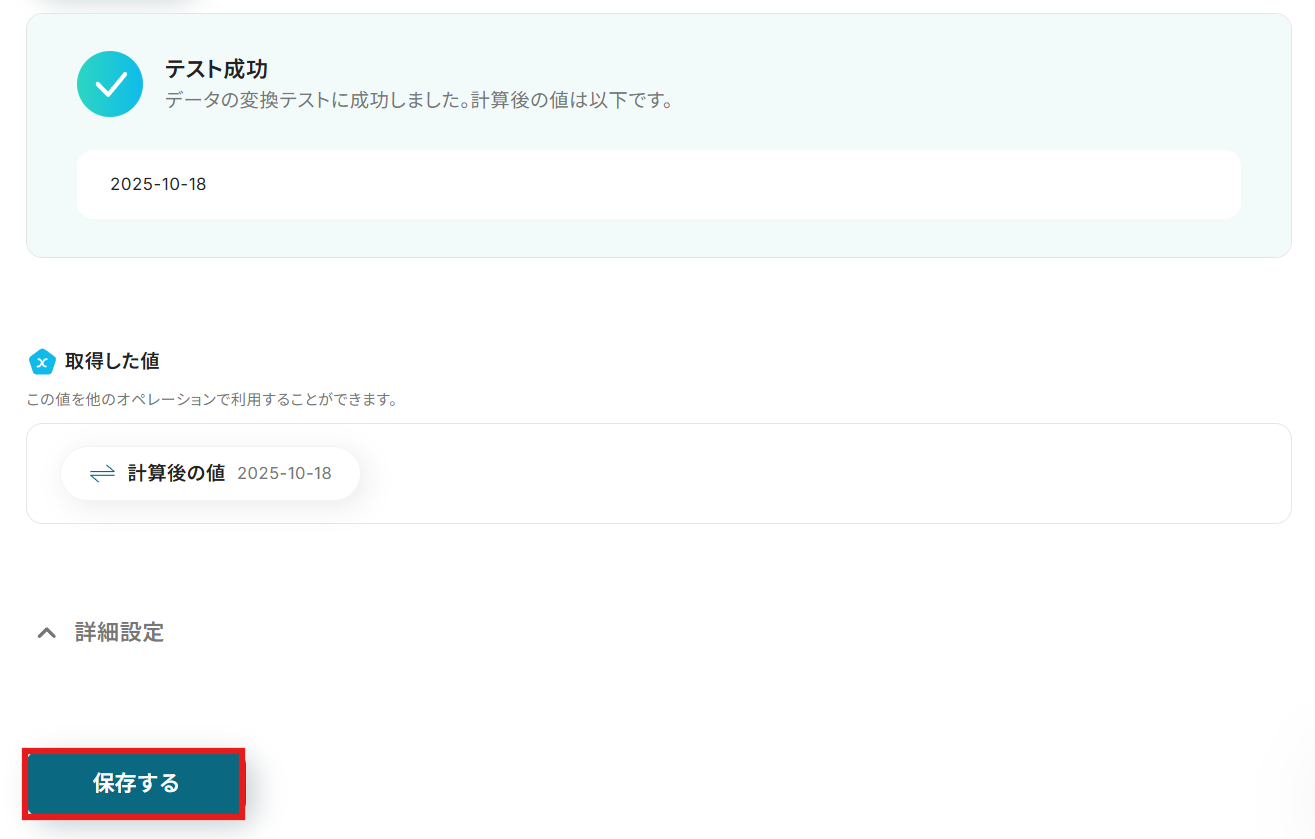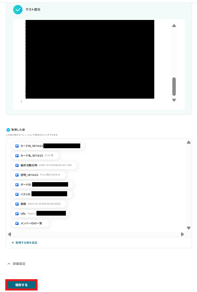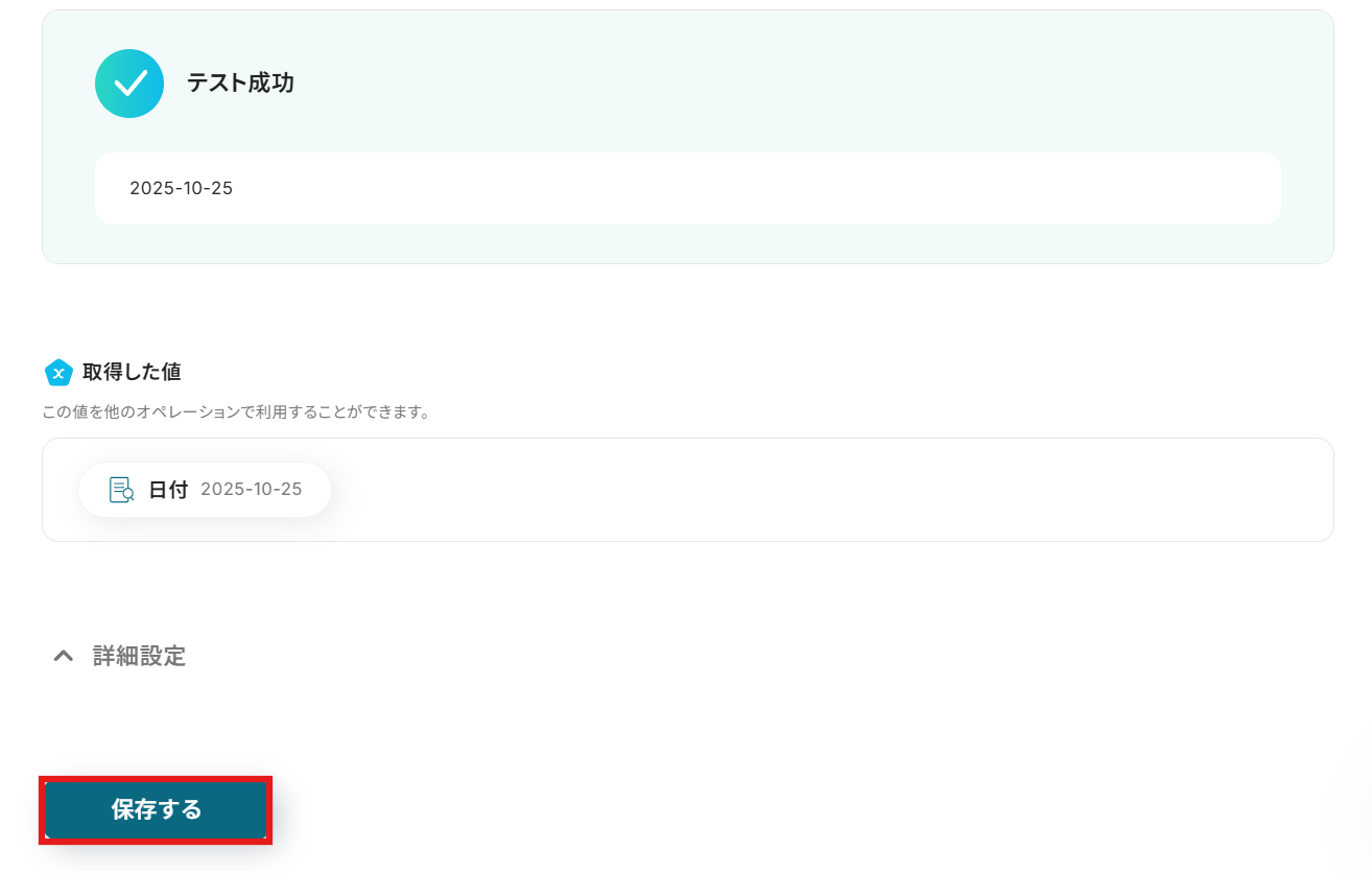 テストが成功し、取得した値が表示されたら設定を保存します。