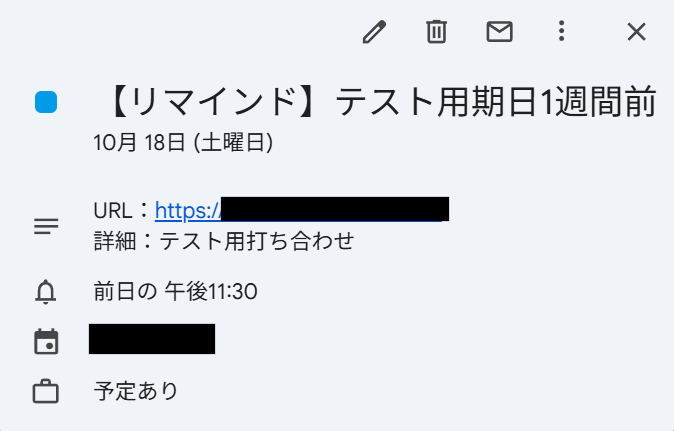 テストが成功すると、Googleカレンダーに予定が作成されていますので確認してみてください。