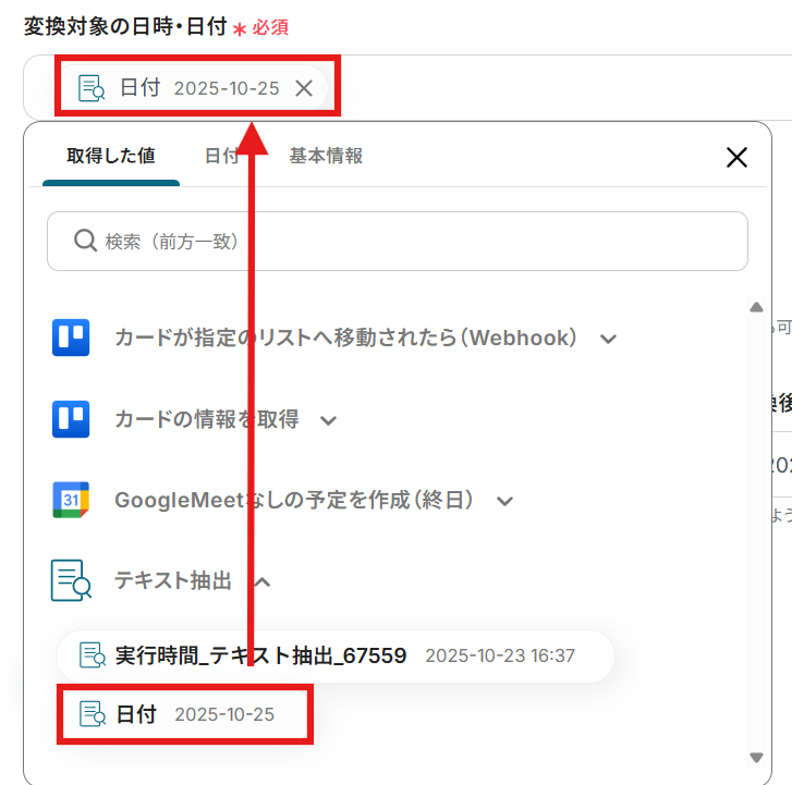 先ほどテキスト抽出で取得した値の中から選びましょう。