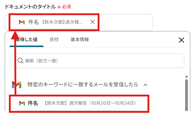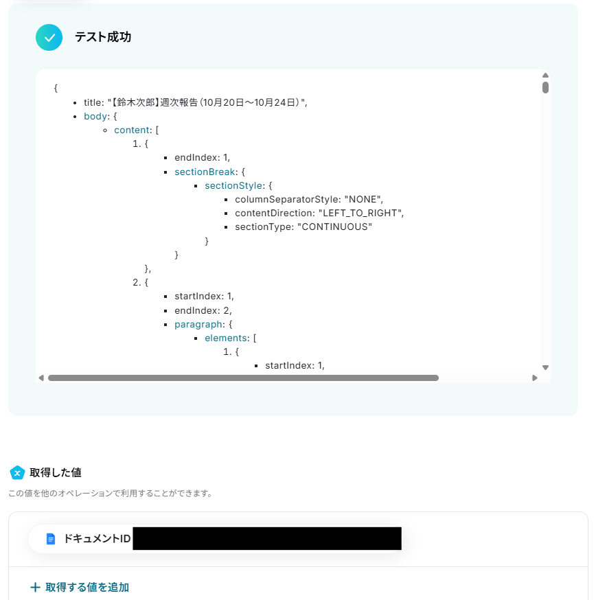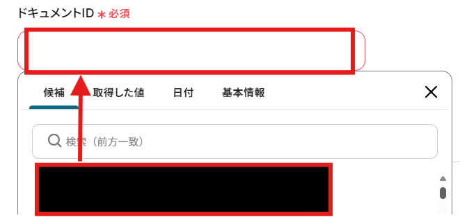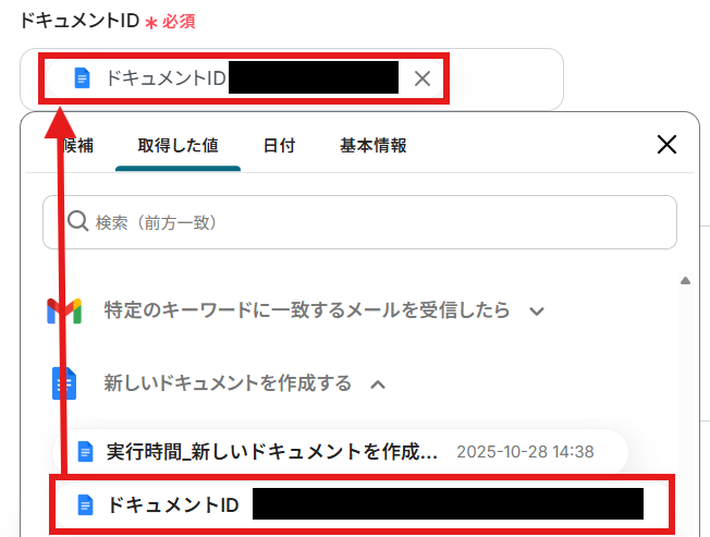 「ドキュメントID」を「取得した値」から設定しましょう。