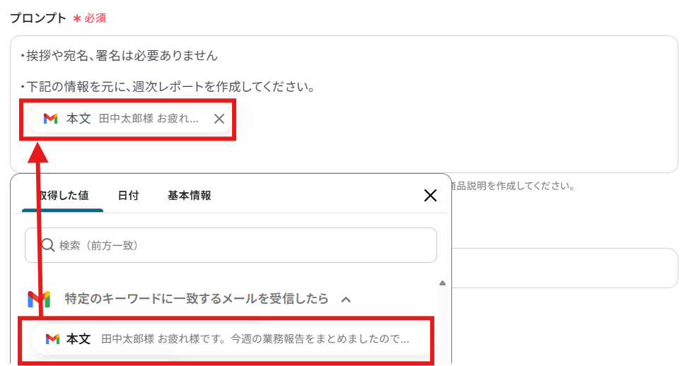 Gmailで特定のキーワードに一致するメールを受信したら、新規GoogleドキュメントにAIで週次レポートを作成する