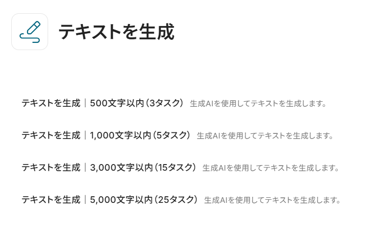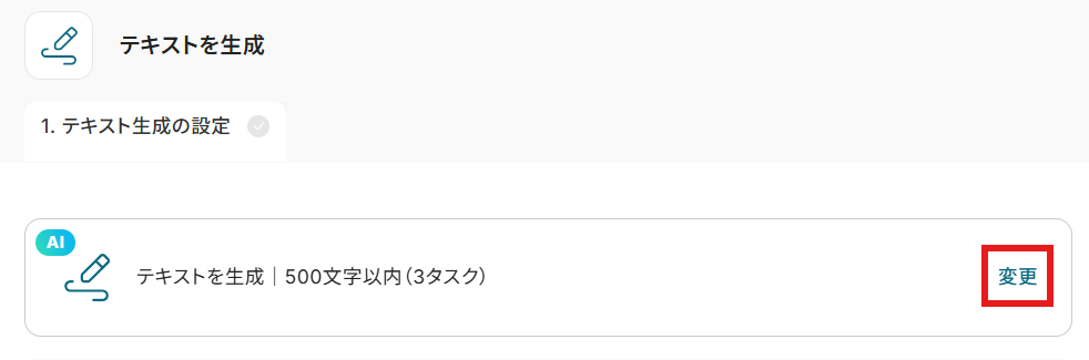 デフォルトで「テキストを生成|500文字以内(3タスク)」が設定されていますが、「変更」から任意のものに変えられます。