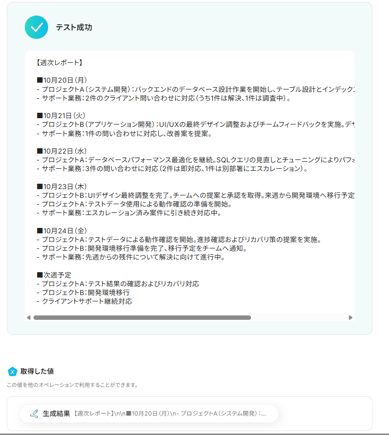 例えば、Googleスプレッドシートにレコードとして追加したり、Slackの特定チャンネルにレポートを通知したりすることができます。