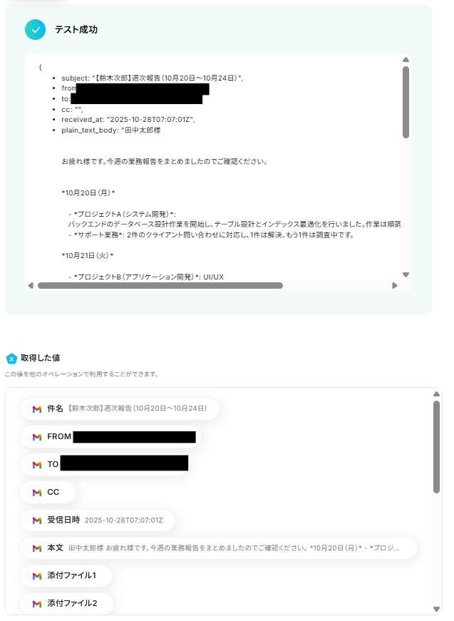 ・件名、本文:それぞれ入力します。②で取得した値を埋め込むことも可能です。