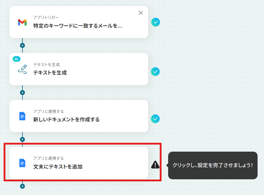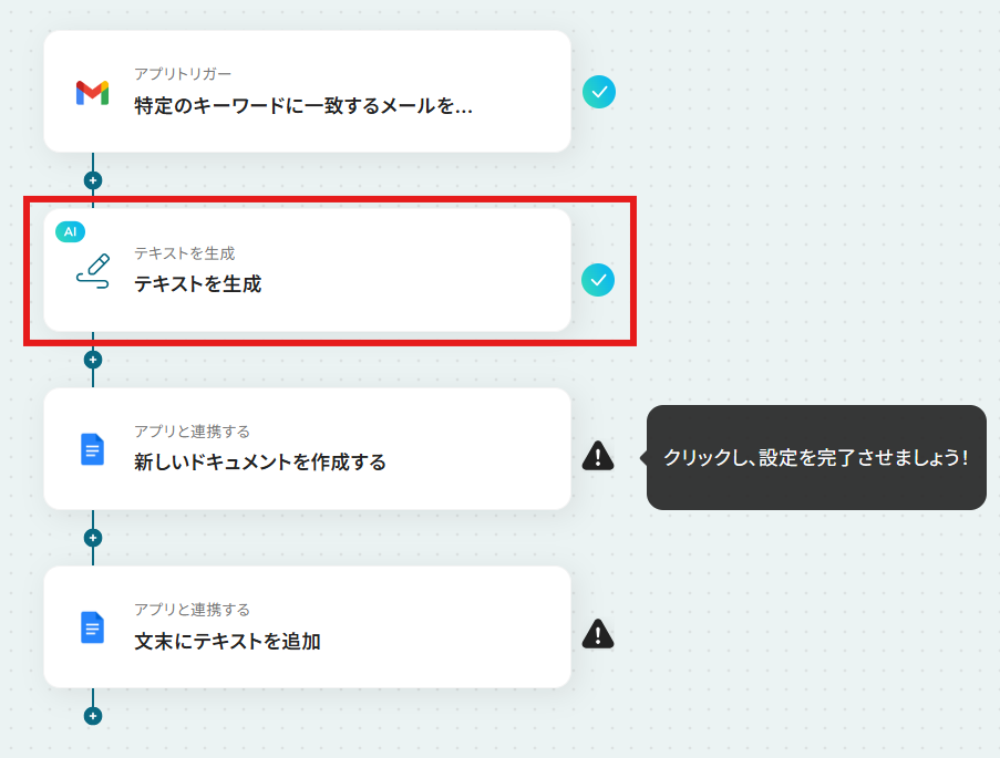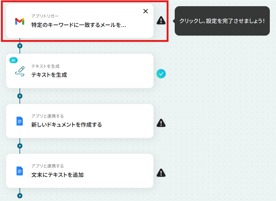 それではここから代表的な例として、Gmailで特定のキーワードに一致するメールを受信したら、その内容をAIが解析し、Googleドキュメントに週次レポートを自動で作成するフローを解説していきます!