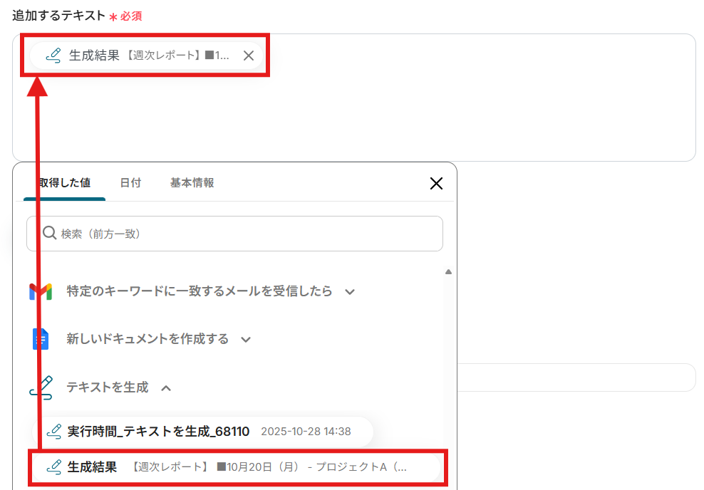 「追加するテキスト」を「取得した値」から設定しましょう。