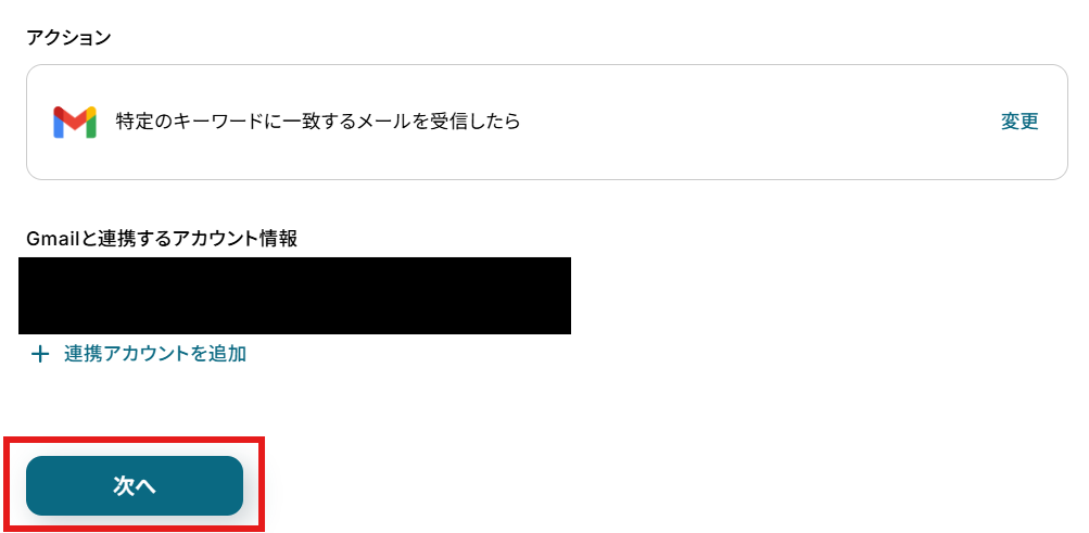 「Gmailと連携するアカウント情報」を確認し、「次へ」をクリックして進んでください。
