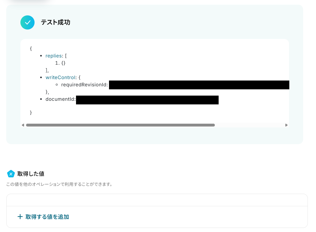 テストに成功すると「取得した値」に反映されます。