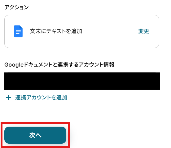 「Google ドキュメントと連携するアカウント情報」を確認し、「次へ」をクリックして進んでください。