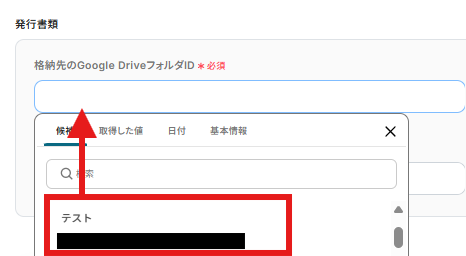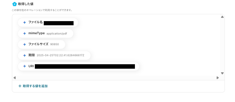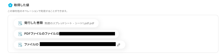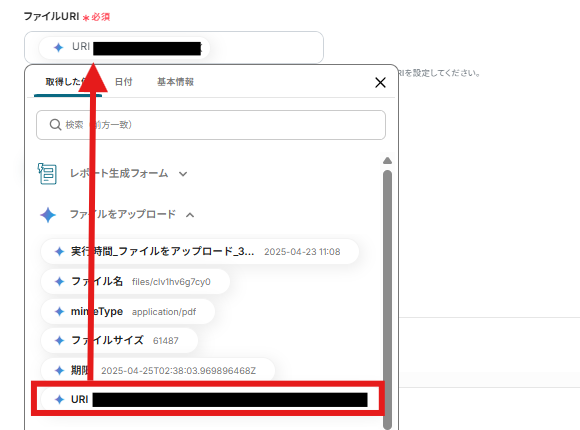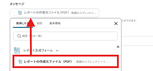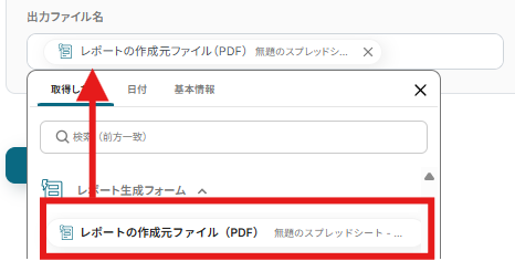 出力ファイル名についても「取得した値>レポートの作成元ファイル(PDF)」をクリックしましょう。