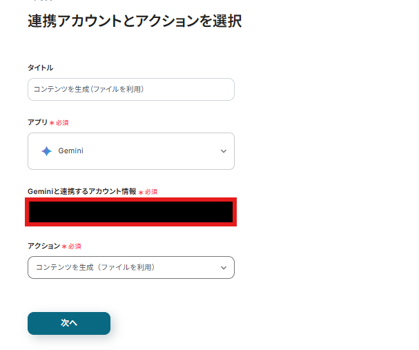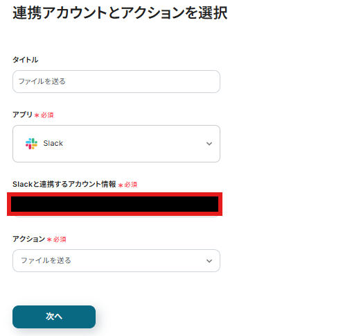 連携アカウントとアクションを選択する画面では、Slackのアカウントを確認し「次へ」をクリックします。