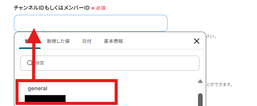 チャンネルIDもしくはメンバーIDは以下の画面のように候補から、通知を受け取りたいチャンネルIDもしくはメンバーIDを入力しましょう。