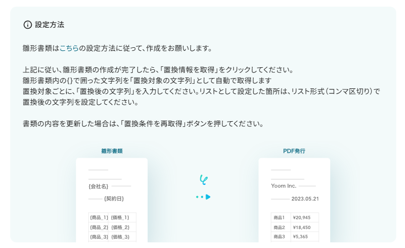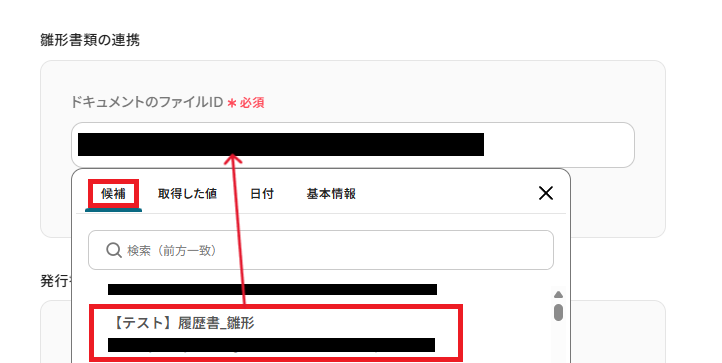 作成したらYoom画面に戻り、雛形書類の連携を行います。 「ドキュメントのファイルID」を候補から選択してください。