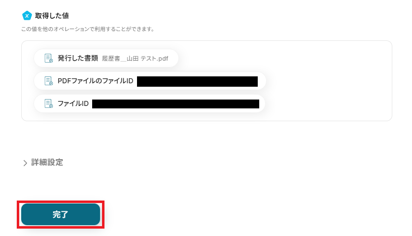 確認できたらYoomに戻り「完了」をクリックしてください。