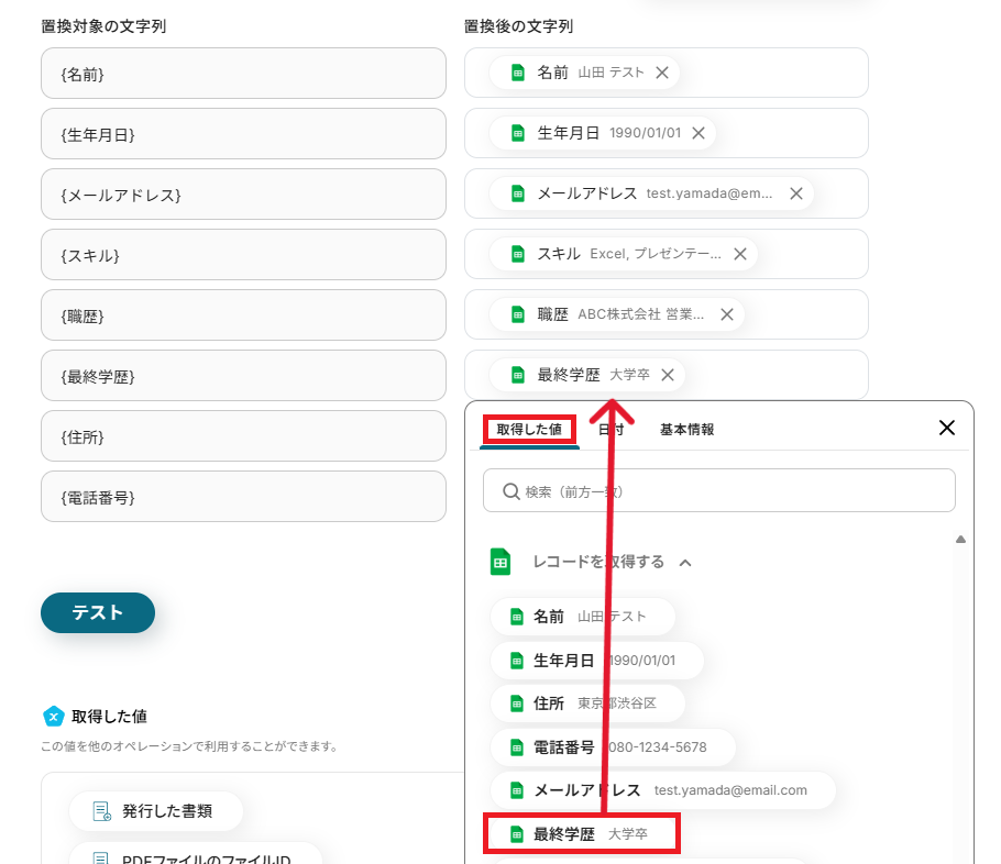 確認できたら、置換後の文字列を取得した値を引用し 設定していきます。 全ての項目の設定が完了したら、「テスト」をクリックしましょう。