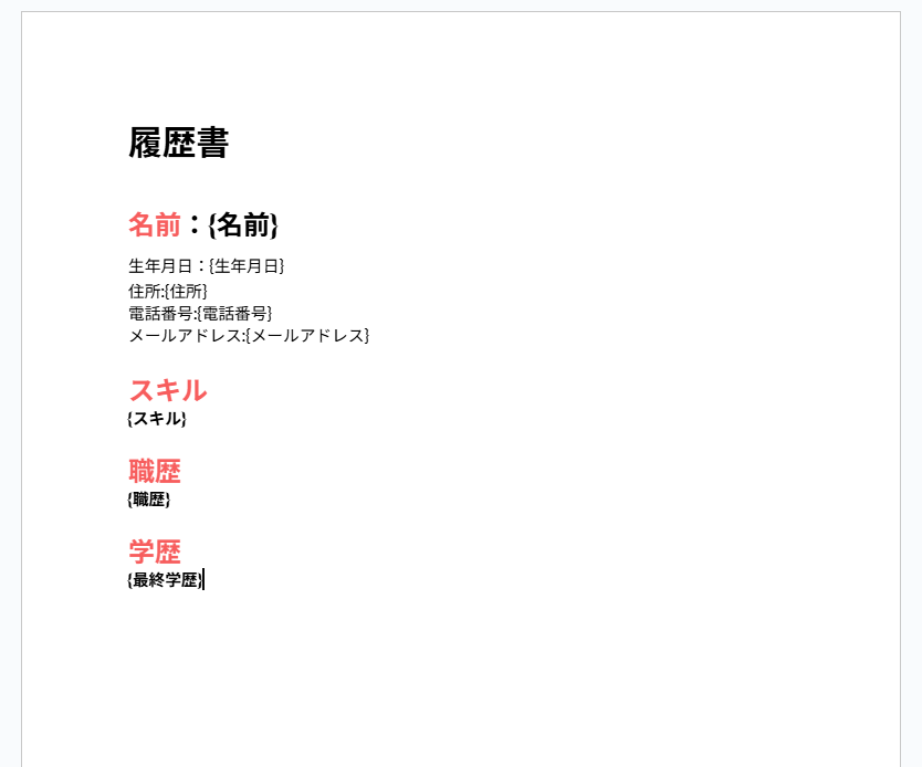 履歴書を発行するにあたって、雛形となる書類の準備が必要なので、Google ドキュメントで雛形書類を作成しておきましょう。 詳しくは「書類を発行する 」の設定方法をご確認ください。 今回は以下のような履歴書の雛形を準備しました。{}で囲んだ項目が取得した値と置換されます。