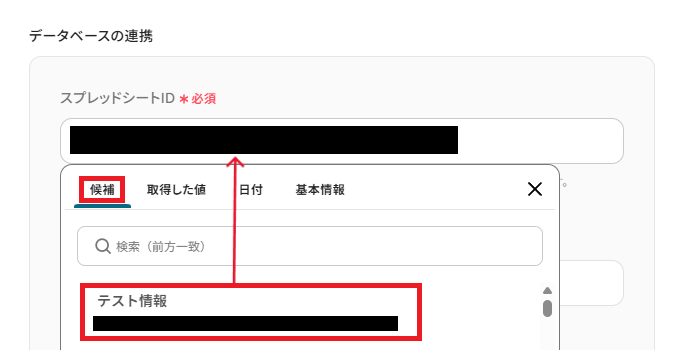 データベースの連携を行います。 「スプレッドシートID」と「スプレッドシートのタブ名」は、【候補】から先ほど作成したシートを選択してください。