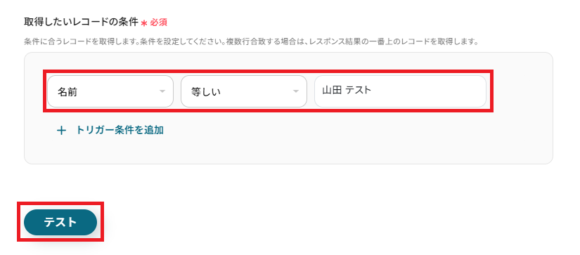 「取得したいレコードの条件」は、複数存在するレコードの中から取得対象となるレコードを指定します。 今回は名前が等しいレコードを取得するため、以下のように設定しました。 設定が完了したら「テスト」を実行しましょう。