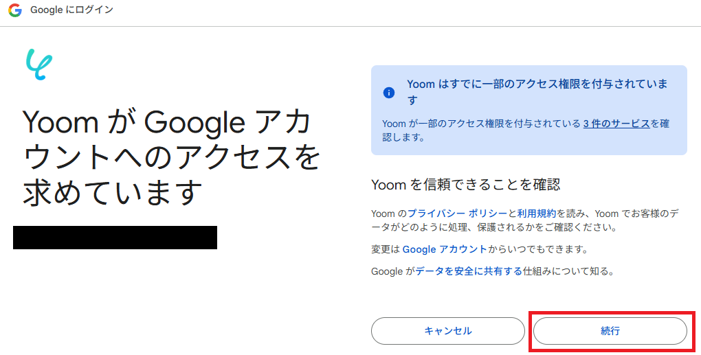 Yoomが信頼できることの確認が求められるので必要事項を確認し、「続行」を選択します。