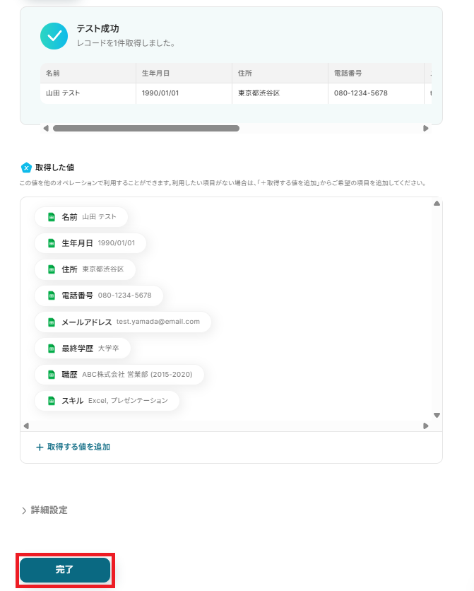 トリガーやオペレーション設定時に、「テスト」を実行して取得した値のことを指します。 後続のオペレーション設定時の値として利用でき、フローボットを起動する度に変動した値となります。 レコードの情報が反映していればOKです。「完了」を押して次に進みましょう!